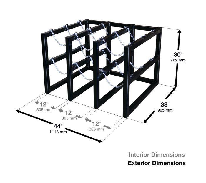 Recommended for indoor or outdoor bulk cylinder storage, barricade racks surround cylinders with 2-in (51-mm) square steel structural tubing, continuously seam welded at all junction points and sealed with exterior grade powder-coat paint for long lasting strength, durability and dependability. Tops ground smooth and capped with high-density polyethylene (HDPE) caps to prevent corrosion and injuries. Features two levels of welded steel chains for each cylinder and clasps to connect the chains to the rack, ensuring a snug fit. Pre-drilled 0.531-in (14-mm) diameter floor mounting holes included on lower tube structure. For seismic installations, add Model 35350 S4-rated anchor bolts (not included).