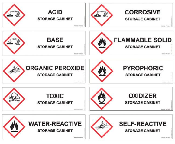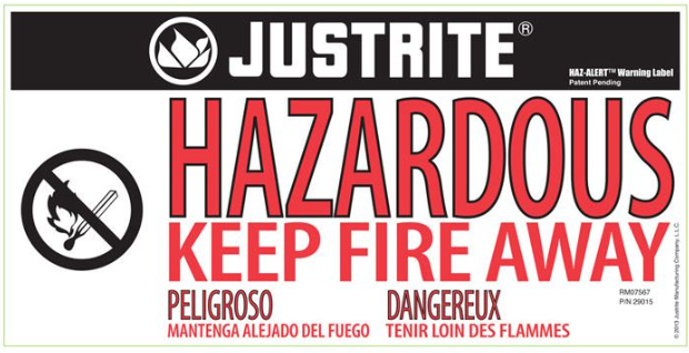 Exclusive to Justrite, each cabinet comes with a "Hazardous - Keep Fire Away" label, as well as a pack of ten application-specific labels to choose from and apply to the cabinet in order to indicate its contents.