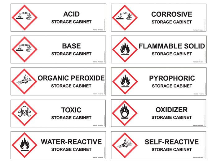 Exclusive to Justrite, each cabinet comes with a "Hazardous - Keep Fire Away" label, as well as a pack of ten application-specific labels to choose from and apply to the cabinet in order to indicate its contents.