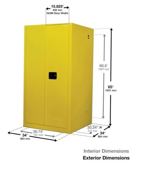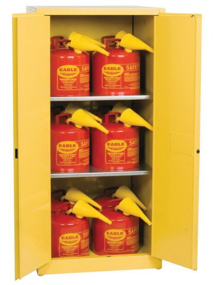 Eagle Flammable Liquid Safety Cabinet Combo is a standard 45 Gallon, manual closing cabinet with 2 shelves and 12 UI50FS safety cans. Constructed of 18-gauge (1 mm) steel, the sides, top, bottom, and doors are double-walled with a 1-1/2 in (3.8 cm) air space between walls. Includes two vents, each have 2 in (5.1 cm) threaded fittings and a fire baffle and cap. Cabinets have a high gloss powder coat finish with red trilingual warning, plus grounding attachment, 3-point latch system, and 2-in (5.1 cm) raised, leakproof door sill. Each shelf is adjustable on 3 in (7.6 cm) centers, supported by 4 brackets, with a 350 lbs (159 kg) safe allowable load. Cabinets are FM-Approved and meet NFPA Code 30 and OSHA requirements.
