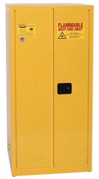 Eagle Flammable Liquid Safety Cabinet Combo is a standard 60 Gallon, self-closing cabinet with 2 shelves and 12 UI50FS safety cans. Constructed of 18-gauge (1 mm) steel, the sides, top, bottom, and doors are double-walled with a 1-1/2 in (3.8 cm) air space between walls. Includes two vents, each have 2 in (5.1 cm) threaded fittings and a fire baffle and cap. Cabinets have a high gloss powder coat finish with red trilingual warning, plus grounding attachment, 3-point latch system, and 2-in (5.1 cm) raised, leakproof door sill. Each shelf is adjustable on 3 in (7.6 cm) centers, supported by 4 brackets, with a 350 lbs (159 kg) safe allowable load. Cabinets are FM-Approved and meet NFPA Code 30 and OSHA requirements.