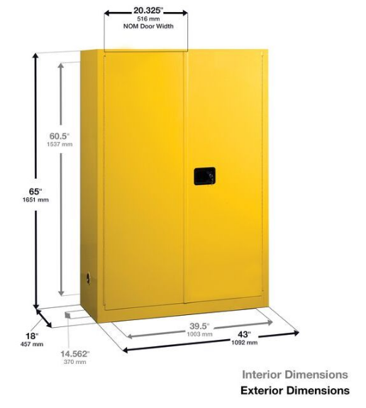 Eagle 60 Gallon, self-closing, Paint and Ink Safety Cabinet is constructed of 18-gauge (1 mm) steel. The sides, top, bottom, and doors are double-walled with a 1-1/2 in (3.8 cm) air space between walls. Includes two vents, each have 2 in (5.1 cm) threaded fittings and a fire baffle and cap. Cabinets have a high gloss powder coat finish with red trilingual warning, plus grounding attachment, 3-point latch system, and 2-in (5.1 cm) raised, leakproof door sill. Each shelf is adjustable on 3 in (7.6 cm) centers, supported by 4 brackets, with a 350 lbs (159 kg) safe allowable load. Cabinets are FM-Approved and meet NFPA Code 30 and OSHA requirements.