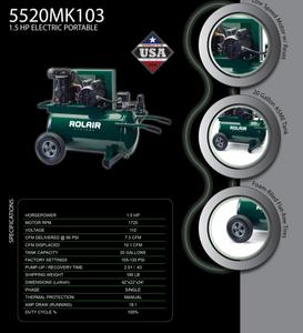 Rolair Systems 90 PSI @ 7.3 CFM Single Stage 115/230 Volt – 60 Hz 1.5HP 20gal. Electric Belt Drive Air Compressor