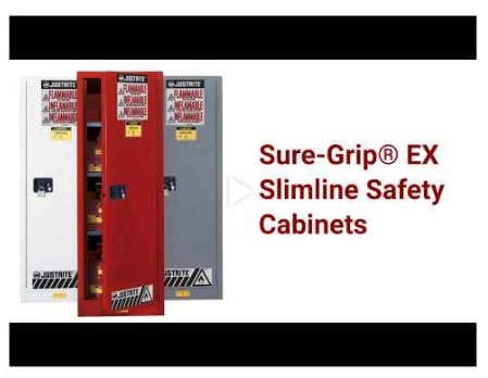 Protect workers, reduce fire risks, and improve productivity by storing flammable fuels and chemicals in code-compliant safety cabinets. Designed to meet OSHA and NFPA standards, Sure-Grip®EX cabinets are constructed of sturdy 18-gauge (1-mm) thick double-wall, welded steel with 1-1/2” (38-mm) of insulating air space for fire resistance. High-performance, self-latching doors close easily and securely for maximum protection under fire conditions. Fail-safe closing mechanism ensures three-point stainless steel bullet latching system works every time.