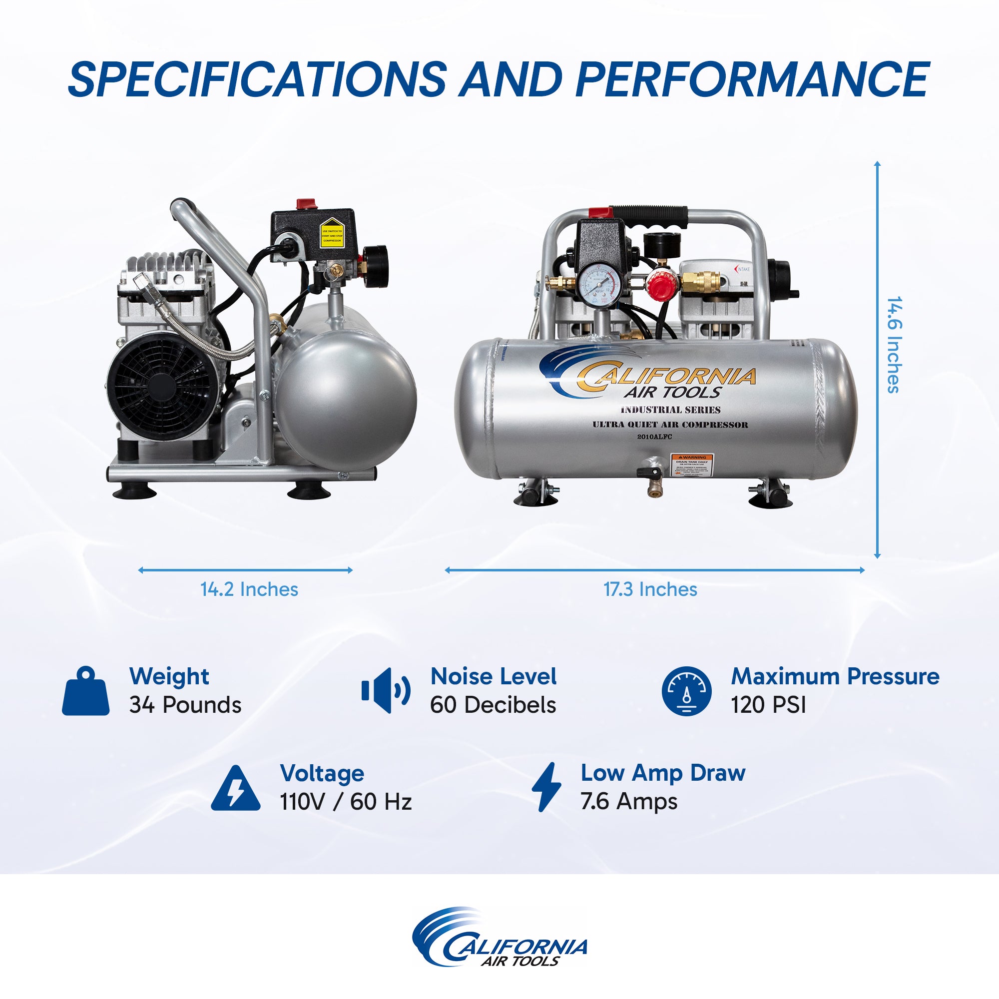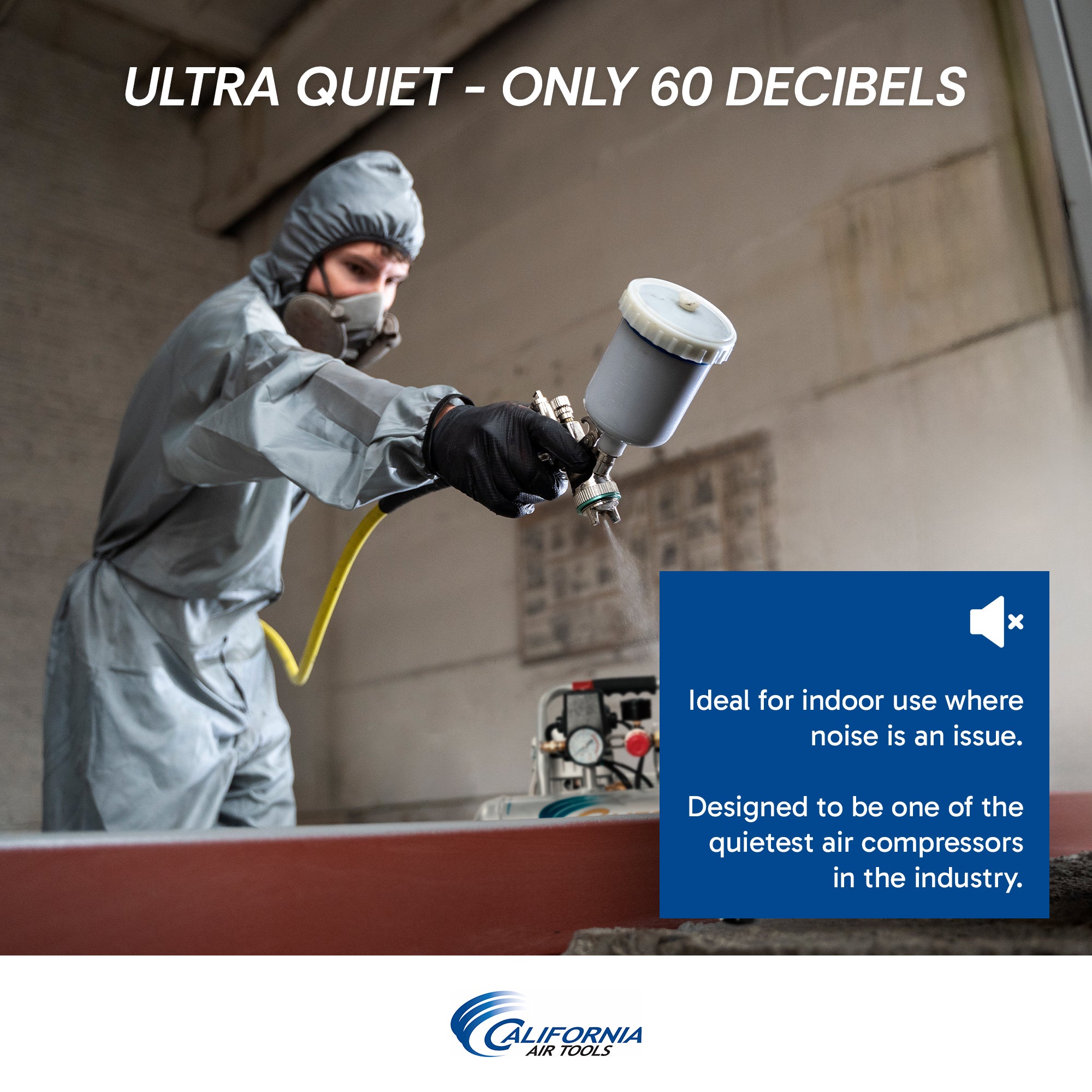 The CALIFORNIA AIR TOOLS 2010ALFC Ultra Quiet air compressor is designed to be one of the quietest air compressors in the industry having only 60 decibels of sound.