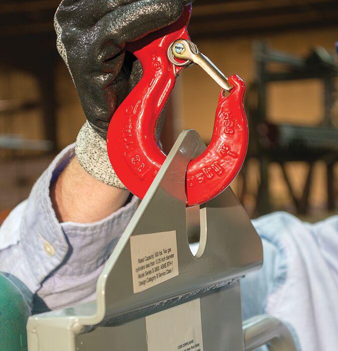 Locking posts and collar plates ensure total cylinder immobilization for hoisting applications