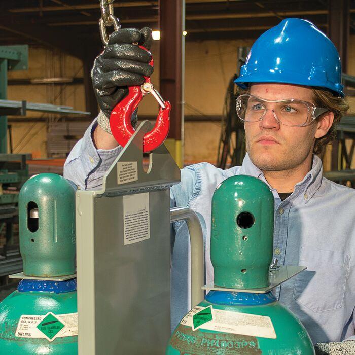 Two heavy-duty 1.5- x 54-in (38-mm x 1372-mm) polypropylene support straps, lab tested to 1138-lb (516-kg), feature steel cinch buckles for secure attachment of cylinder—eliminate any cylinder rolling potential seen in chain-secured units. Included welded loop chains provide a secondary means for securing the cylinders. Exclusive bumper guard edging grips cylinder and minimizes damage to cylinder and hand truck. Triple grip push handle greatly enhances safety on top heavy loads by expanding available grip area for improved leverage and swing radius. Includes tool box attachment with integral lockable lid for torch storage.