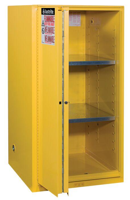 Protect workers, reduce fire risks, and improve productivity by storing flammable fuels and chemicals in code-compliant safety cabinets. Designed to meet OSHA and NFPA standards, Sure-Grip®EX cabinets are constructed of sturdy 18-gauge (1-mm) thick double-wall, welded steel with 1-1/2” (38-mm) of insulating air space for fire resistance. High-performance, self-latching doors close easily and securely for maximum protection under fire conditions. Fail-safe closing mechanism ensures three-point stainless steel bullet latching system works every time.