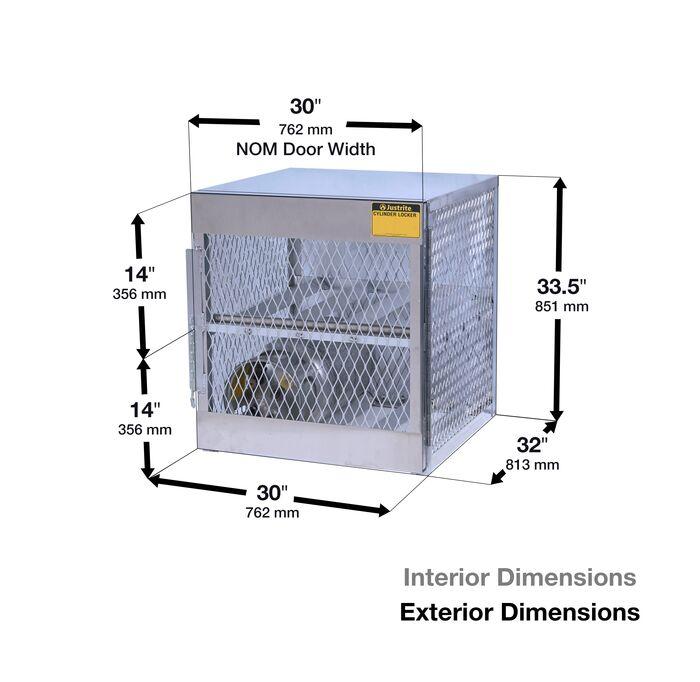 Safely holds four 20 or 33 lb (9 or 15 kg) liquid petroleum gas cylinders with exterior dimensions of 33.5 x 30 x 32 in (851 x 762 x 813 mm), stored horizontally