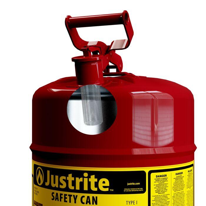 Made from high-grade coated steel, each can is tested to guarantee 100% leakproof construction. The tough powder-coat finish resists chemicals and stands up to demands of rigorous use. Each Justrite safety can is equipped with a stainless steel flame arrester which dissipates heat to stop flashback ignition. Cans up to 1 quart (1L) feature a trigger-release handle, while larger capacities have a swinging handle to greatly ease carrying of heavier loads.