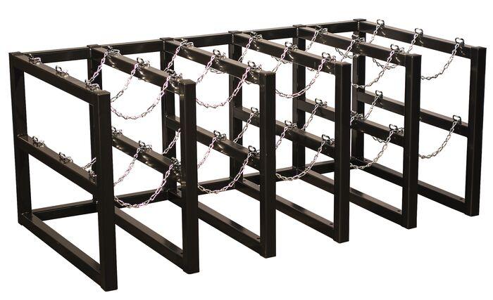 Recommended for indoor or outdoor bulk cylinder storage, barricade racks surround cylinders with 2-in (51-mm) square steel structural tubing, continuously seam welded at all junction points and sealed with exterior grade powder-coat paint for long lasting strength, durability and dependability. Tops ground smooth and capped with high-density polyethylene (HDPE) caps to prevent corrosion and injuries. Features two levels of welded steel chains for each cylinder and clasps to connect the chains to the rack, ensuring a snug fit. Pre-drilled 0.531-in (14-mm) diameter floor mounting holes included on lower tube structure. For seismic installations, add Model 35350 S4-rated anchor bolts (not included).