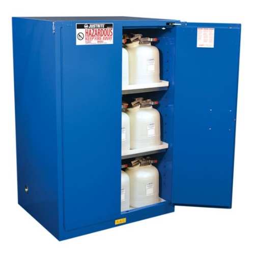 Justrite Hazardous Material Safety Cabinets have the same quality safety features as the cabinets for flammables. All models come with double-wall construction, dual vents, grounding wire connections, adjustable shelves, leakproof sills, three-point self-latching doors and leveling feet. Self-close door(s) shuts and latches automatically when a fusible link melts at 165°F (74ºC) under fire conditions. Unique, concealed self-closing mechanism offers obstruction-free access to contents.