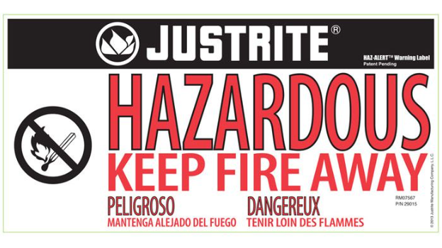 Exclusive to Justrite, each cabinet comes with a "Hazardous - Keep Fire Away" label, as well as a pack of ten application-specific labels to choose from and apply to the cabinet in order to indicate its contents.
