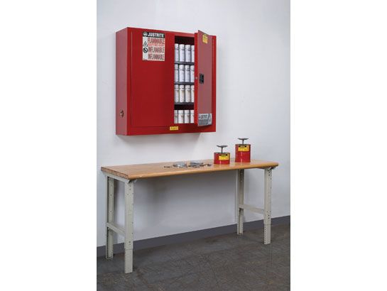 Easily separate and identify Class III combustibles using these red safety cabinets. Adjustable shelves accommodate many smaller paint tins, aerosols and inks found in printing, painting, furniture and motor vehicle operations. Sure-Grip® EX combustibles storage cabinets have all the same quality features as Justrite’s flammable cabinets as outlined below.