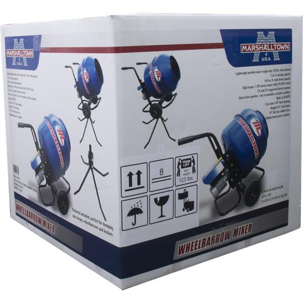 The lightweight and portable MARSHALLTOWN Wheelbarrow Mixer can mix 3 cubic feet of material at 26 rotations per minute. It ensures consistent and high-quality mixing, and you can easily pour the mixed material at a 24-inch height. Powered by a strong ½ horsepower electric motor, the mixer is CE/CSA approved and has an on/off switch. It features a sturdy 24” steel drum and 10” flat-free rubber tires. The direct-drive gearbox eliminates the need for belts or pulleys. The mixer is easy to assemble and use, and it comes with a pedestal for convenient pouring into forms, wheelbarrows, or buckets. You can choose the plug-in type (USA, UK, or France) that suits your location. For professional results on your project, this high-quality mixer ensures consistent and efficient material mixing.