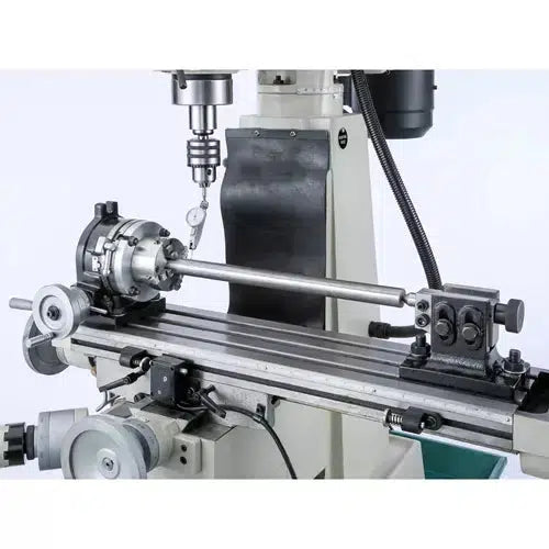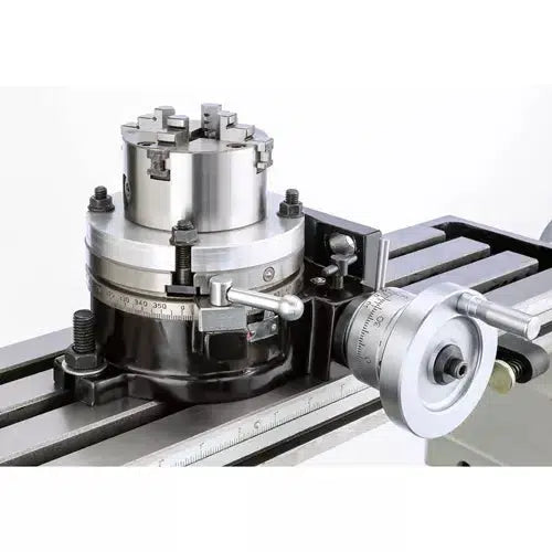 A rotary table allows drilling or cutting at exact intervals around vertical and horizontal axes.