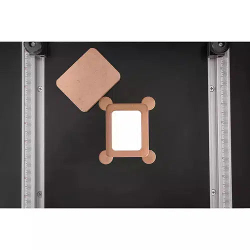 The fence slides in the dual 1/2" t-tracks that have been embedded in the 23-3/4" x 15-3/4" table. These tracks also have the same scaling to indicate the fence positioning. The fence brackets allow for smooth sliding and secure lock-down.