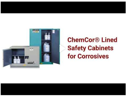 ChemCor® Lined Acid Safety Cabinets have the same quality features found in Justrite's flammable cabinets — including double-wall, 18-gauge (1mm) welded steel construction, 2" (51mm) liquid-tight containment sump, dual vents, adjustable shelves, three-point stainless steel bullet self-latching doors with U•Loc™ padlockable handle and Haz-Alert™ reflective warning labels. An all epoxy baked-on powder-coat finish, inside and out, provides increased chemical resistance. Interior ChemCor® liner ensures complete corrosion resistance and protection. Manual-close door(s) opens to a full 180 degrees and self-latches when pushed closed.